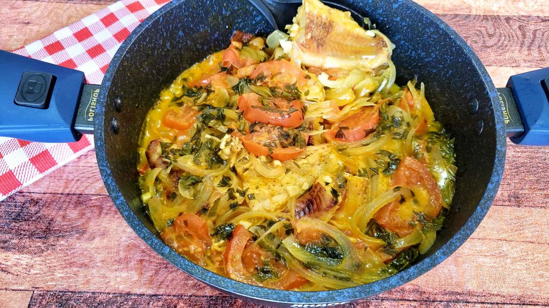 - Coloque os peixes e adicione os pimentões por cima. Acrescente mais cebolas e tomates, depois o restante dos peixes e finalize colocando o restante das cebolas e dos tomates.